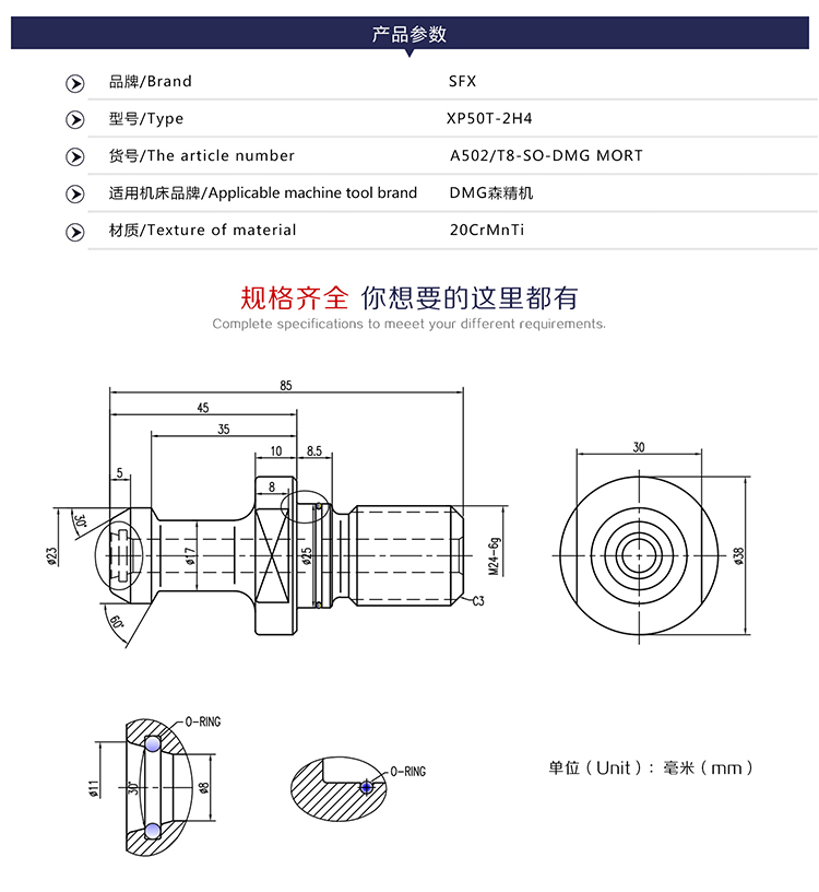 SFX森精機(jī)XP50T-2H4雙O型圈數(shù)控拉釘 通孔通水CNC加工中心拉釘、結(jié)構(gòu)平衡螺母 簡(jiǎn)介: 咨詢熱線:400-6700-379 留言給我們 產(chǎn)品詳細(xì) 上一篇:LDB40-T7.35-47 辛辛那提機(jī)床拉釘 下一篇:BT-CAT50-45°U/TO-6.3牧野機(jī)床拉釘 分享到:0 用手機(jī)看 拍下二維碼,信息隨身看 試試用微信掃一掃,在你手機(jī)上繼續(xù)觀看此頁(yè)面。